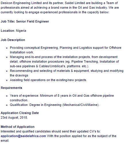 - Desicon Engineering Limited and its partner, Saidel Limited is in need of a Chief Electrician Location: Nigeria Years of experience: Minimum of 8 years in Oil and Gas offshore pipeline construction. CV's to: application@saidelafrica.com